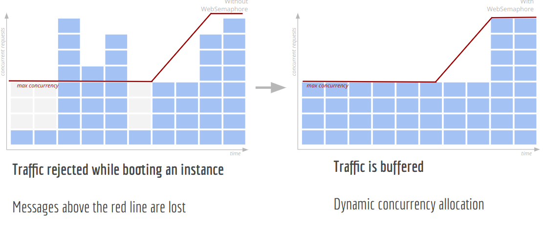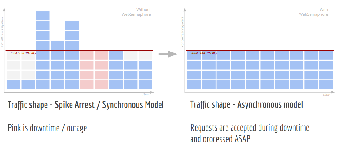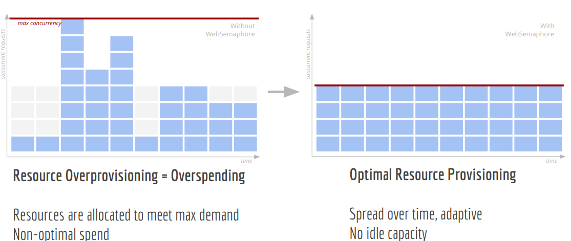 While scaling up is easy with modern providers, it’s also expensive. Planning for maximum capacity is the most performant version while minimal capacity will not hold up to any traffic spikes. WebSemaphore allows planning for average traffic while allowing the resource to be used at optimal capacity at all times.